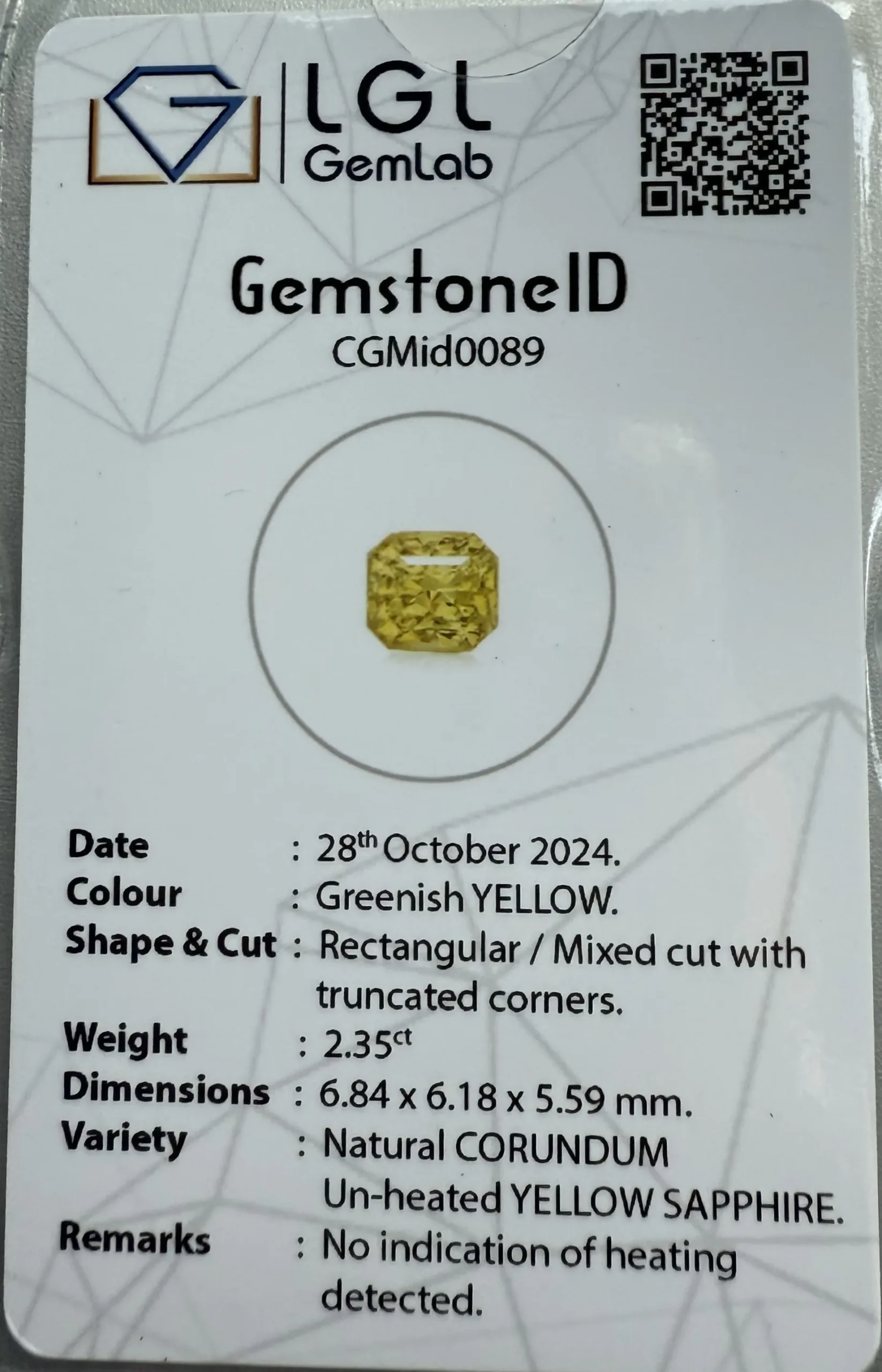 Unheated Yellow Sapphire Rectangular Shape with Truncated Corners- 2.35ct